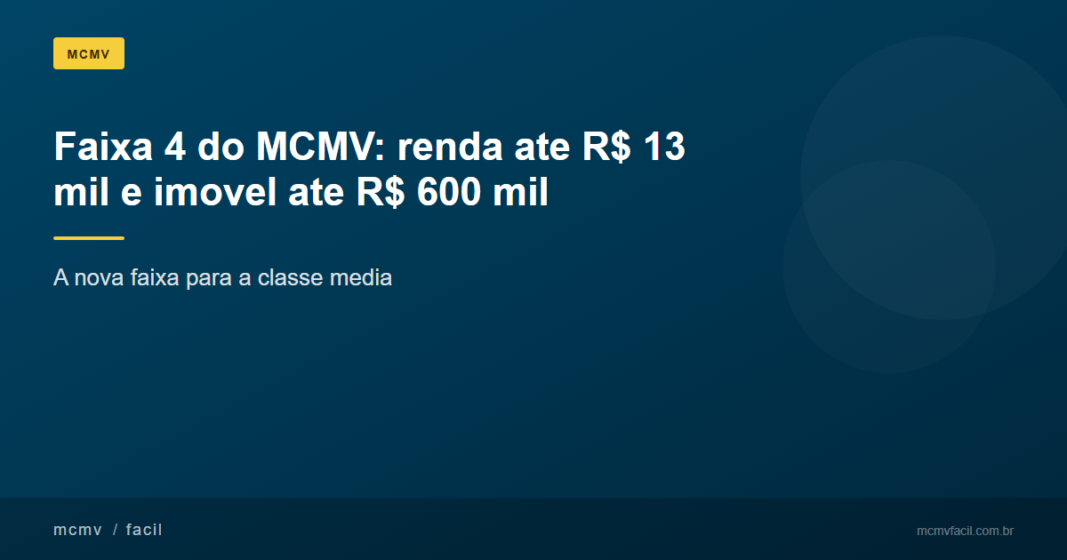 Quando foi lançada, a Faixa 4 estabelecia teto de renda familiar de R$ 12.000 e valor máximo do imóvel de R$ 500 mil. Em março de 2026, o governo atualizou esses limites para R$ 13.000 de renda e R$ 600 mil de imóvel, acompanhando a valorização dos preços no mercado e a correção inflacionária dos salários. Essa atualização foi importante porque, em muitas capitais, apartamentos de dois quartos já ultrapassavam os R$ 500 mil, o que excluÃa boa parte das unidades disponÃveis.